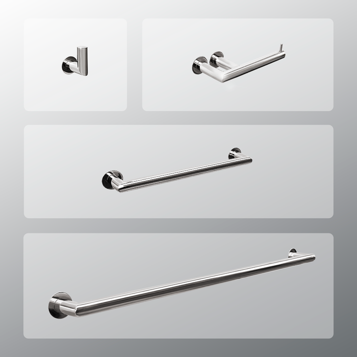 Ref.: KITME4 contém: Cabide Simples, Papeleira, Toalheiro de rosto 30 cm, Toalheiro de banho 60 cm.