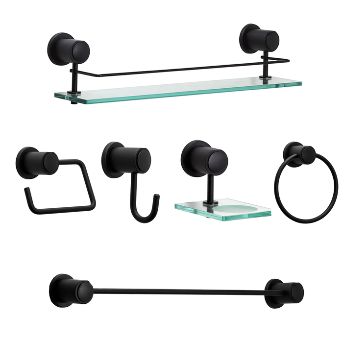Kit Acessórios Suportes Banheiro Lavabo 6 Peças Preto Luxo Além do seu design moderno, atributos técnicos indispensáveis para a sua utilização. Elegante e extremamente resistente, garante confiança e segurança. Acabamento exclusivo preto de alta resistência à corrosão, conservando a beleza do produto por muito mais tempo Linha Baronesa C40 Black - Porta shampoo; Papeleira; Cabide; Saboneteira; Porta toalha argola e barra Informações adicionais Utilização: Banheiro, lavatório, lavabo – Parede Pintura eletrostática com acabamento preto fosco Sistema de dupla fixação com furos oblongos Especificações técnicas Material: Liga de aço Inox com cobre e ABS Vidro temperado incolor Medidas: 13cm Altura x 03cm Largura x 11cm Comprimento (Gancho Cabideiro) 17cm Altura x 16cm Largura x 5,5cm Comprimento (Porta Toalha Argola) 6cm Altura x 07cm Largura x 54cm Comprimento (Porta Toalha Barra) 11cm Altura x 15cm Largura x 09cm Comprimento x (Porta Papel Higiênico) 12cm Altura x 10cm Largura x 14,5cm Comprimento (Saboneteira) 08cm Altura x 50cm Largura x 10cm Comprimento (Porta Shampoo) Peso: 250g (Gancho Cabideiro), 260g (Porta Toalha Argola), 620g (Porta Toalha Barra), 360g (Porta Papel Higiênico), 410g (Saboneteira). Conteúdo da embalagem: Produtos mencionados do kit e componentes de instalação (buchas e parafusos)