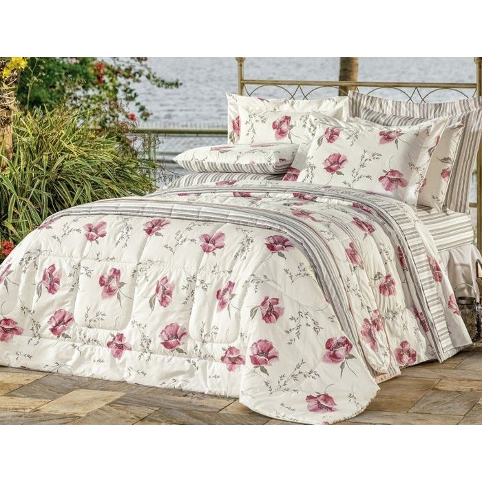 Composto por um acolchoado e dois porta travesseiros. As peças de ramos com flores, proporcionam um visual acolhedor e aconchegante.
