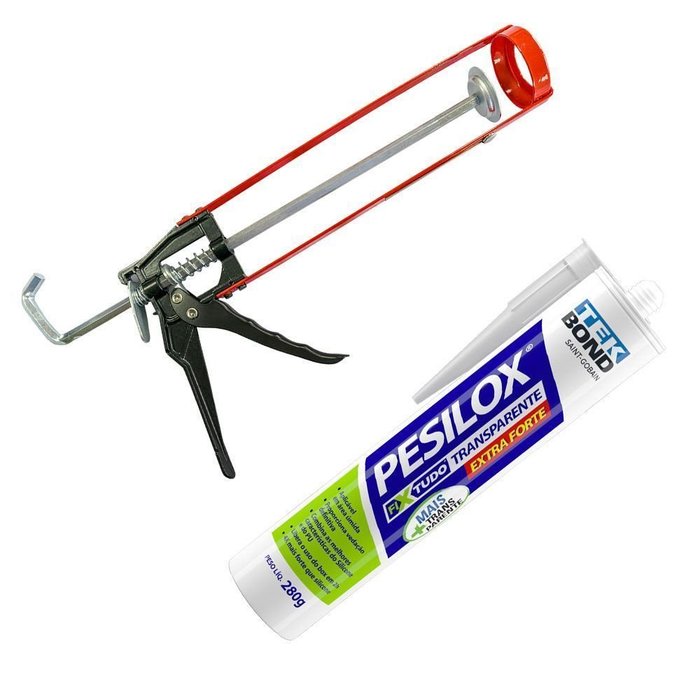 Acompanhando o cartucho, encontra-se a pistola aplicadora de silicone reforçado aberto, fabricada em aço resistente. Com dimensões de 35cm de comprimento, 20cm de altura, 6cm de largura e peso de 0,42kg, esta pistola proporciona uma aplicação precisa e confortável do adesivo em diversas situações.