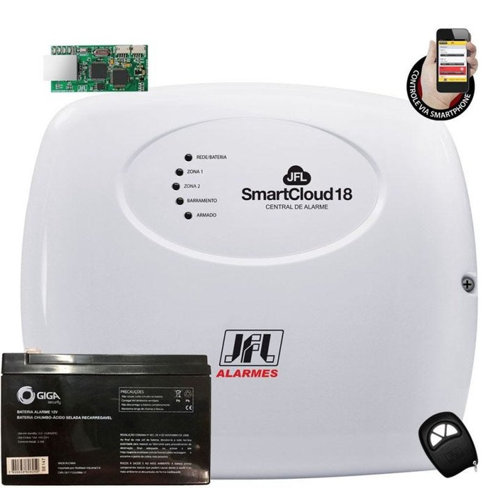 O KIT de alarme JFL com central de alarme Smart Cloud 18 de até 18 Zonas. Também estão inclusos nesse KIT a bateria para Centrais de Alarme, Sirene, Controle, sensor magnético FIT JFL e módulo ethernet ME 04 JFL. Esse KIT é ideal para quem busca um monitoramento eficaz de alta qualidade, e pode ser instalado em residências e empresas. A central Smart Cloud 18 da JFL que acompanha este KIT faz parte das centrais de alarmes. A grande versatilidade desta central possibilita que o KIT Alarme atenda perfeitamente a maioria dos projetos de pequeno e médio porte. Além disso, esta central de alarme é autenticado pela e opera por meio Ethernet, PGM. A Smart Cloud 18 da JFL é a central com mais tecnologia, que vem com zona de barramento onde você consegue conectar 16 sensores com apenas 1 par de fio, com ela você vai conseguir conectar a sua central via Smartphone, onde possibilita as ações mais práticas e rápidas. » Central com 18 zonas (2 zonas mistas + 16 zonas de barramento). » Programação via computador ou controle remoto. » Proteção contra curto de bateria. » Rearme automático após desarme. » Auto-arme por falta de movimento. » Função Bootloader. » Permissão de PGM por usuário. » Monitora saída auxiliar, sirene, bateria e teclados. » Módulo Ethernet e módulo GPRS* com 2 SIM cards, opção de arme/desarme por SMS e envio de mensagens no disparo. Active Mobile Com a tecnologia do Active Mobile, você vai conseguir ter acesso para o monitoramento de sua central a qualquer momento com muito mais segurança, facilidadee praticidade. Com esse aplicativo você poderá verificar o status da central em tempo real, inibir zonas, desativar e ativar PMGs, visualizar as zonas em planta baixa, etc. Conexão central e app O Módulo Ethernet que vem junto ao kit é muito fácil de conectar a central JFL SmartCloud 18 no Active Mobile. Siga os passos abaixo: 1 - Plugar o cabo no módulo Ethernet. 2 - Após baixar o app no smartphone, leia o QR Code. 3 - Agora basta fazer o cadastro na nuvem. Contém: 01 Central 01 Bateria 12 7ah 01 Sirene 04 Sensor Mag FIT JFL 01 Mod. Ethernet ME 04 JFL 01 Controle