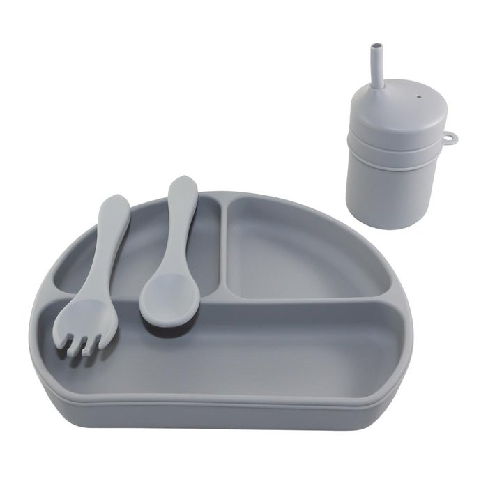 Kit Alimentação Bebe Prato Com Tampa Copo Garfo Colher Silicone BLW Cinza