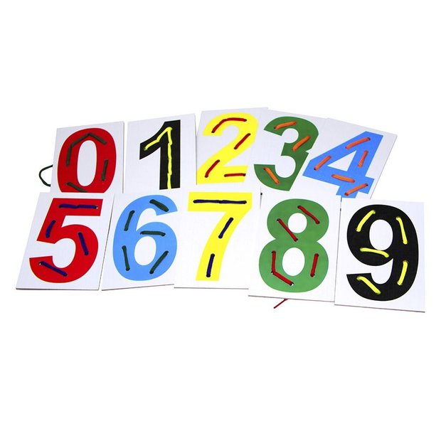 Descritivo detalhado: Confeccionado em M.D.F. composto por 10 bases perfuradas medindo 10 x 15 cm e 10 cadarços coloridos de poliéster medindo aproximadamente 70 cm, bases serigrafadas em policromia ultravioleta atóxica com numerais de 0 a 9. Embalagem: Saco plástico com solapa colorida em papel couchê.