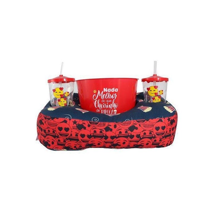 Almofada porta pipoca Emoji Cheiro De Pipoca é super macia e confortável, acompanha dois copos com canudo e um balde para pipoca.