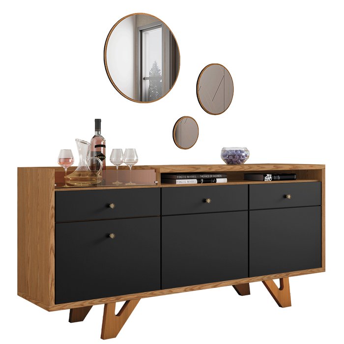 Kit Aparador Buffet Bar 2 Portas Valentim Com Espelho Caribe Freijó B01 Carvalho Preto - Lyam