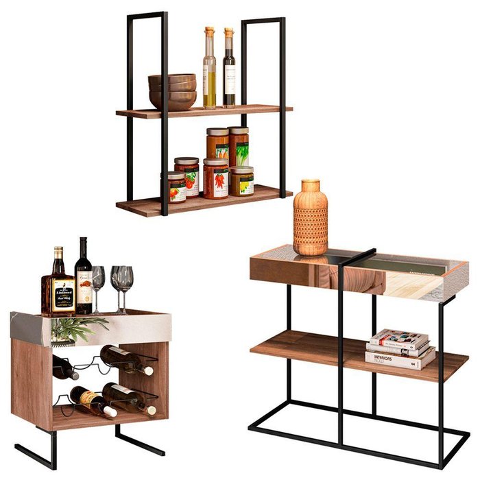 Esse kit de aparador, adega e prateleira Ariel, é repleta de sofisticação e elegância, com um espelho no aparador e na adega que oferece aos produtos mais amplitude de reflexão e traz muito requinte, tampo em BP de 15mm que oferece ao produto mais resistência à umidade, riscos, mofo e bactéria, e este super material ainda viabiliza valores mais naturais em seu visual que similiarizam aos desenhos de madeiras naturais, estruturas em metal antioxidantes com pintura eletroestática. Toda mistura de materiais abre um mundo diferente de conceitos no que se refere a Design, e aqui está um produto que na sua criação foi pensado em você, no moderno, no atual, no conceito industrial de ser, na visão de que não se pode privar a criatividade de quem quer fazer um belo ambiente.