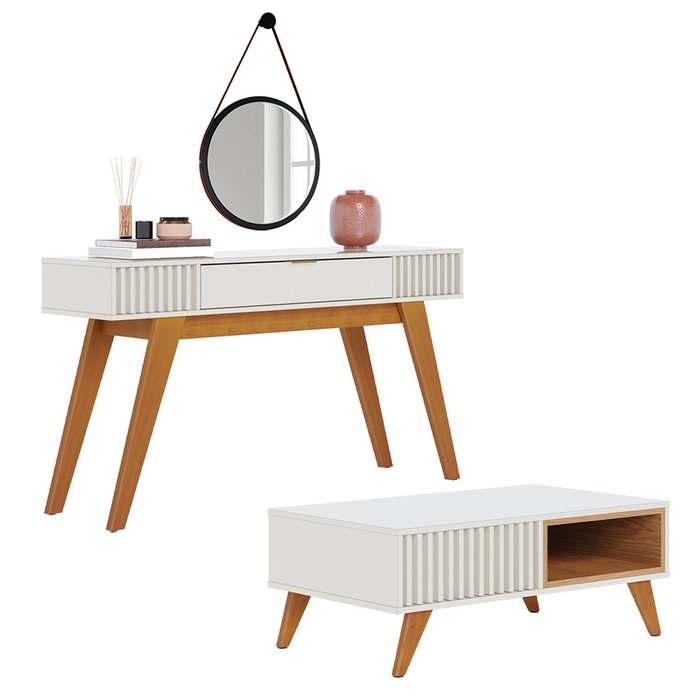 Com design agradável e muita identidade o Kit Aparador Sala Com Mesa De Centro Delta e Espelho Adnet Preto C04 Freijó Off White - Lyam Decor dará um up em sua decoração! Os detalhes ripados contrastam com o nicho, em tonalidade diferente, criando uma atmosfera harmoniosa no ambiente, já os pés em madeira maciça remetem-nos ao estilo retrô, complementando lindamente a peça. Como se já não fosse o bastante o espelho garante destaque e sofisticação ao kit e agrega ainda mais valor.
