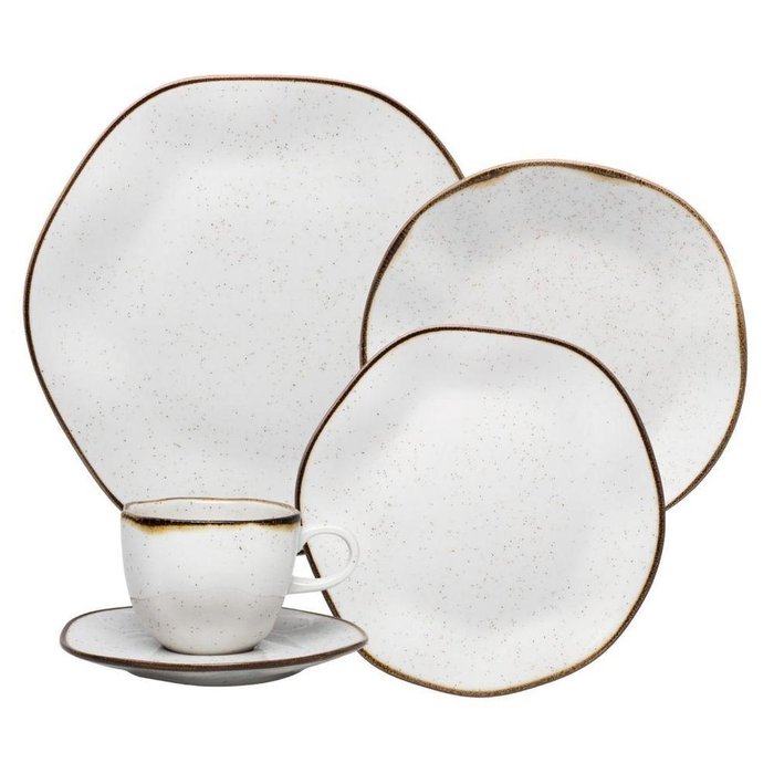 - Dimensões: Xícara com Pires 220ml / Prato Sobremesa 21,5cm / Prato Raso 27cm / Prato Fundo 22cm