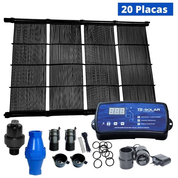 Aproveite sua piscina durante mais meses no ano utilizando um Aquecimento Solar com Selo A do Inmetro e que lhe traga mais economia!Produto: PLACA COLETOR SOLAR 3,00 x 0,30 MetrosMarca: Top SolarRecomendações de Uso: Aquecimento Solar PiscinaPaís de origem: BrasilEspecificações técnicas:Para cada Unidade Placa Coletora Modelo 300- Peso: 1,8kg- Peso com água: 4,3 kg- Largura: 30 cm- Comprimento: 300 cm- Área do Coletor: 0,90 m² por coletor- Aquecimento por M² (climas quentes): Cada coletor aquece 0,90 m² de piscina- Material: Polipropileno- Dimensões Embalagem - Cm (AxLxP): 3,00 x 0,25 x0,35 Metros- Composição/Material: Termoplástico- Tipo do Produto: Placa Solar- Cor: Preto- Garantia do Fornecedor: 3 Anos- Dimensões de cada Placa - Cm (AxLxP): 0,08 x 0,30 x 3,00 Metros- Certificado: Inmetro Registro: 001 460/2017Incluso na embalagem:20 Placas Top Solar +Kit Instalação+1 Controlador Automatizado de Temperatura Ecomasol (já incluso luvas, sensores e fonte)+1 Válvula Quebra Vácuo/Eliminadora de Ar (Válvula Ventosa)+1 Válvula De Retenção (Para manter as placas cheias)CONTROLADOR DE TEMPERATURAMarca: Ecomasol/Ts SolarIncluso: Um Painel de Comando; Dois suportes para sensores (Piscina e Coletores) ; Dois sensores de temperatura (tipo NTC) e Fonte 5V e 1AAlimentação: 90 à 240 Vac (50/60Hz)Corrente máxima: 15 A (Obs: Em ligações para Bombas maiores que ½ Cv, em 127 Volts ou maiores que 1 Cv em 220 Volts, utilizar chave contatora, caso contrário a saída do equipamento será danificada);Dimensões (L x A x C): 197 MM X 35 MM X 85 MMDiferencial para desligar a bomba: 1 a 14 °CDiferencial para ligar a bomba: de Dif. Ligar + 1° a 15 °CTemperatura de aquecimento da piscina: 20 a 40 °CVÁLVULA QUEBRA VÁCUO Eliminadora de Ar (Válvula Ventosa)Marca: Ts SolarMedida do Produto: 3/4T. Máxi: 90o CP. Máx: 10 BarPeso: 0,120KgAcessórios: Com CapsVÁLVULA DE RETENÇÃOMarca: CiplaVálvula tipo universal, devem ser utilizada na posição vertical;Medida do Produto: 50mmPressão até 10kgf/cm a temperatura de 20C;CUSTO DE ENVIOConsulte o Custo de Envio disponível logo abaixo do valor do anúncio, os valores são tabelados de acordo com seu Estado-UF, o pagamento é realizado no momento da confirmação do pedido, selecionando o estado de destino.Diferencial de QualidadeAs placas coletoras Top Solar são fabricadas em módulos com resinas termoplásticas de alta qualidade. - Excelente absorção por m²- Produto ecologicamente correto- Leve, flexível e fácil instalação;- Resistente à alta pressão;- Alto desempenho na geração e manutenção de água quente;- Maior área de absorção por metro quadrado, com alto grau de eficiência;- Material atóxico sem risco de corrosão e de calcificação;- Maior performance do mercado;- Menor manutenção com garantia de 3 anos na placa;Os coletores Top Solar foram desenvolvidos para aquecer a água da piscina até 30 ° C. São produzidos com polipropileno, sendo atóxicos e, logo, resistindo aos produtos químicos utilizados no tratamento da água da piscina.O Sistema foi produzido especificamente para aquecimento solar de piscinas, para utilização em outra finalidade é necessária avaliação e recomendação de um profissional técnico de acordo com a estrutura e particularidades da instalação pois compromete a eficiência, qualidade e garantia do produto.Requisitos de Instalação:*Verificar se a bomba do filtro tem potência para vazão mínima de 200 litros / Hora. Consulte a vazão da motobomba de acordo com o modelo/potência da bomba, litragem da piscina e altura do telhado a ser instalado na ficha técnica do fabricante da motobomba;*Kit Fechamento: Necessário para conexão das placas;*Válvula Quebra Vácuo (instalar no cavalete): Evita que excesso de ar na rede hidráulica ocasione ruídos excessivos e alivia a pressão no sistema, aumentando a vida útil dos coletores;*Tubulação indicada Canos e conexões marrons 40mm;*Válvula retenção (para manter as placas cheias da água): Instalar na saída da bomba;*As Placas devem ser amarradas com Arame galvanizado;*Fiação suficiente para levar ligação do sensor do telhado até o controlador;*Cola (recomendamos usar cola para água quente);*Telhado voltado ao norte, com espaço suficiente para instalação das placas de acordo com a quantidade e tamanho dos coletores.A instalação é simples e rápida!Perguntas frequentes:1 - Quantas placas preciso para minha piscina?R.: A Quantidade de Placas Coletoras necessárias para sua Piscina é Calculada a partir da metragem quadrada da sua piscina (Comprimento X Largura = M²). O M² da PISCINA é igual a quantidade em M² de PLACAS necessárias (Cálculo para piscinas localizadas em regiões quentes).Para saber o M² de cada placa, basta calcular o Comprimento X Largura da Placa. Exemplo: Placas de 3,00x0,30Metros = 0,90M².A Quantidade de placas necessárias = M² da piscina DIVIDIDO pelo M² da Placa.Exemplo: Para uma piscina 6 X 3 Metros, utilizando placas de 3,00 X 0,30 Metros, Calcula: 18M²(piscina) / 0,90M²(placa), 18/0,90 = 20, ou seja, são necessárias 20 placas 3,00x0,30 metros.2 - Posso utilizar para aquecer Caixa D´agua, Banheira de Hidromassagem ou Boiler?R.: O Sistema foi produzido especificamente para aquecimento solar de piscinas, para utilização em outra finalidade é necessária avaliação e recomendação de um profissional técnico de acordo com a estrutura e particularidades da instalação pois compromete a eficiência, qualidade e garantia do produto.