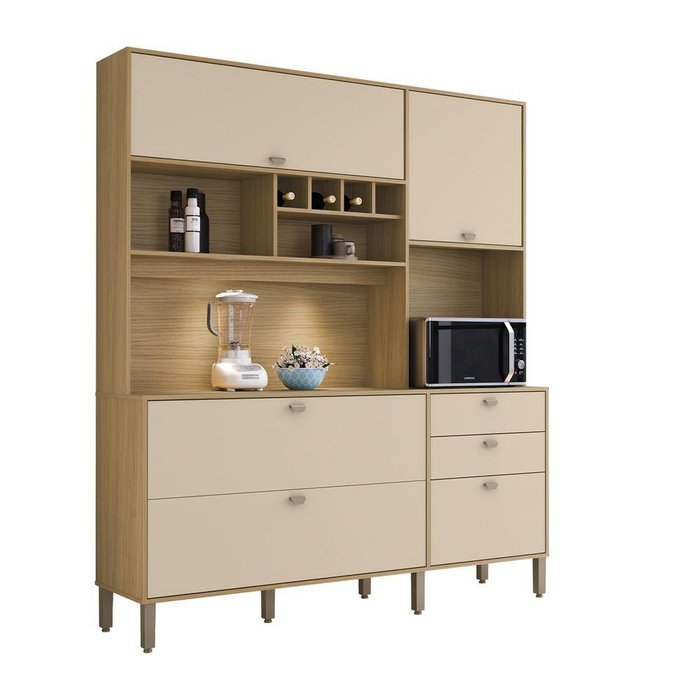 Cozinha Novara com Led é a escolha perfeita para trazer modernidade e conforto para sua casa, com materiais de altíssima qualidade e um amplo espaço que permitirá que você organize sua cozinha do jeito que sempre desejou! Esta cozinha conta com 5 portas, incluindo 2 portas com dobradiças super curvas slow de 35mm, que se fecham suavemente graças a um dispositivo de amortecedores, e 3 portas basculantes com 3 dobradiças curvas de 35mm e 1 pistão a gás em cada uma delas. As gavetas apresentam laterais e contra fundo mais elevados, proporcionando um maior espaço interno, e são equipadas com corrediças telescópicas que garantem uma abertura suave. A distribuição interna desta cozinha é excelente, com a parte superior tendo uma profundidade de 305mm e o balcão inferior com 450mm, incluindo uma divisão estrategicamente projetada para maximizar o espaço de armazenamento de alimentos. A Cozinha Novara também possui 7 pés com regulagem, facilitando o nivelamento do piso, e eles são da mesma cor dos puxadores em PVC. Você pode escolher entre duas opções de cores: Carvalho Americano com Off White texturizado ou Carvalho Americano com Grafite texturizado. Transforme sua cozinha em um espaço moderno e funcional com a Cozinha Novara, projetada para atender às suas necessidades e proporcionar elegância ao seu ambiente. ESPECIFICAÇÕES Características Técnicas: - Desenvolvido em MDP de 15/25mm - Opções de cor: Carvalho Americano Off White texturizado ou Carvalho Americano Grafite Texturizado - Altura: 2100 X Largura: 1800 X Profundidade: 450mm - Quantidade de Portas: ( 5 ) Sendo: ( 3 ) portas basculantes com ( 3 ) dobradiças curva de 35mm e ( 1 ) pistão a gás em cada uma delas. ( 2 ) portas de abrir com ( 2 )Dobradiças super curva de 35mm com amortecedores (slow) em cada uma delas. - Quantidade de Gavetas: ( 2 ) com laterais e contra fundo mais elevados deixando elas mais profundas, e com corrediças telescópicas,Peso suportado ( 7kg ) - Quantidade de Prateleiras: ( 1 ) prateleiras interriças, e se estendem em toda a profundidade do armário ou balcão, Peso suportado ( 7kg ) - Quantidade de Puxadores: ( 7 ) - Material do Puxador: Poliestireno - Quantidade de Pés: ( 7 ) - Material Dos Pés: Poliestireno Com regulagens - Produto Precisa de Montagem?: Sim. Dimensões: Altura: 210 cm Largura: 180 cm Profundidade:45cm