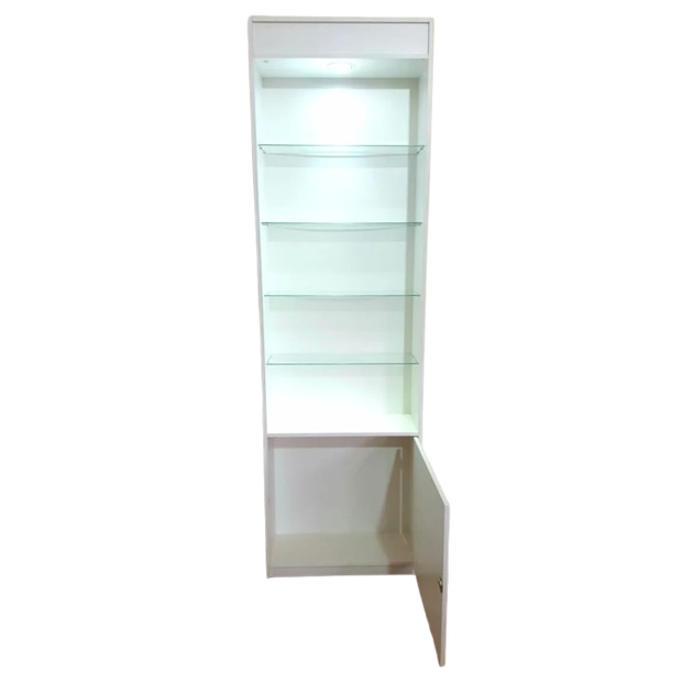 Armário Espaçoso e Estante Versátil: O armário oferece amplo espaço de armazenamento para manter itens organizados e fora de vista, enquanto as estantes são perfeitas para exibir produtos ou materiais de forma acessível e elegante.
