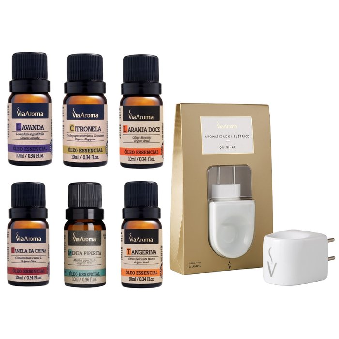 Kit Aromaterapia: Aromatizador Elétrico Porcelana Bivolt Via Aroma e Óleos Essencial Natural 10ml. O Kit Contém: 1 - Aromatizador Difusor Via Aroma Porcelana Preto 6 - Óleos Essenciais Naturais, 10ml cada, Via Aroma. Natural e Puro. No momento estamos enviando estes 6 Óleos Essenciais Naturais Via Aroma Lavanda 10ml Citronela 10ml Laranja Doce10ml Canela da China 10ml Menta Piperita 10ml Tangerina 10ml Caso algum dos aromas acima esteja em falta no momento do envio, enviaremos conforme a disponibilidade em nosso estoque Óleos Essenciais: Você sabia? Os óleos essenciais Via Aroma não são utilizados somente pelo seu aroma, mas também pelas suas propriedades que oferecem muitos benefícios, pois é 100% natural e possui Certificado de análise química pela Universidade Federal de Minas Gerais. Os óleos Via Aroma têm a sua origem na extração de plantas que possuem características curativas utilizadas através da Aromaterapia. O que é Aromaterapia? É a terapia que visa à cura de uma Indisposição Mental ou Física através da inalação do aroma, que penetram em nosso organismo através do sistema respiratório trazendo benefícios físicos e emocionais. Características: Marca: Via Aroma. Conteúdo: 10 ml ? 100% Natural. Frasco: vidro com Bico dosador de plástico. Utilizar os óleos essenciais Via Aroma no Aromatizador Elétrico. Para outros tipos de utilização, procure a orientação de um profissional habilitado e especializado em Aromaterapia. O Aromatizador Elétrico pode ser utilizado em qualquer ambiente com diversas essências, aproximadamente 15 gotas de essência no aparelho aromatizam 30 m² por 4 horas. O aparelho difusor funciona de forma contínua, a utilização e limpeza são práticas. O produto não apresenta risco na sua permanência na tomada. Possui o consumo aproximado de 3W, é bivolt e o plug se adapta a orientação da tomada. A Via Aroma faz a troca para você, o aparelho possui garantia de 1 ano a partir da data da compra, só precisamos que você nos envie o aparelho com a nota fiscal. No caso de problemas no aparelho o cliente será ressarcido do custo de envio e receberá um novo aparelho. TENSÃO ? Bivolt. POTÊNCIA: 5 Watts. DIMENSÕES: 7 cm x 5 cm
