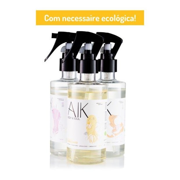 O Kit contém três Aromatizadores de 200ml AIK Body & Soul - Purificante, Energizante e Relaxante, e uma necessaire ecológica