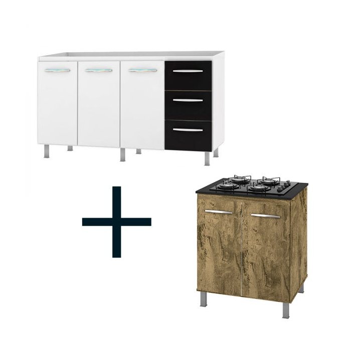 Kit Balcão 160cm Angelis Branco/Preto + Balcão Cooktop 4 Bocas Castanho/Castanho