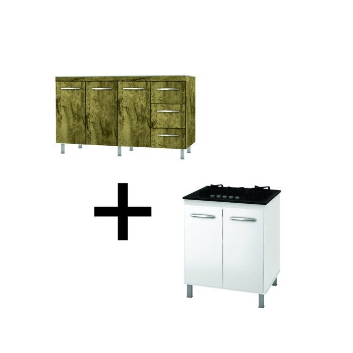 Kit Balcão 160cm Angelis Castanho/Castanho + Tampo Castanho + Balcão Cooktop 5 Bocas Branco/