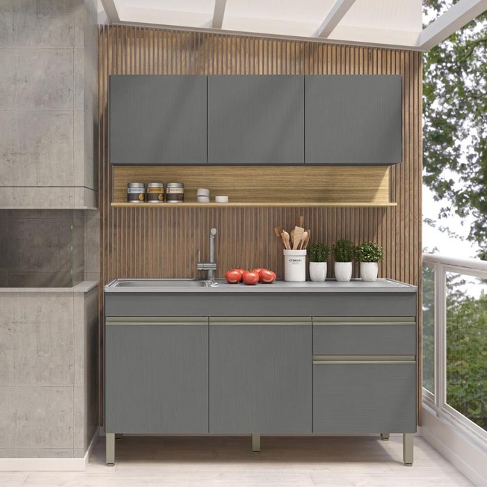Kit Balcão de Pia sem Tampo e Aereo 150 Cm 6 Portas 1 Gaveta Madrid - Gris/gris/cp-freijó Supremo/Supremo/CP-Freijó