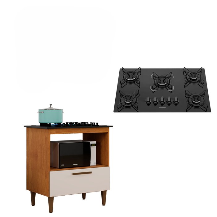 Kit Balcão Eliz 1 Porta Nature Off White com Fogão Cooktop 5 Bocas Itatiaia Preto