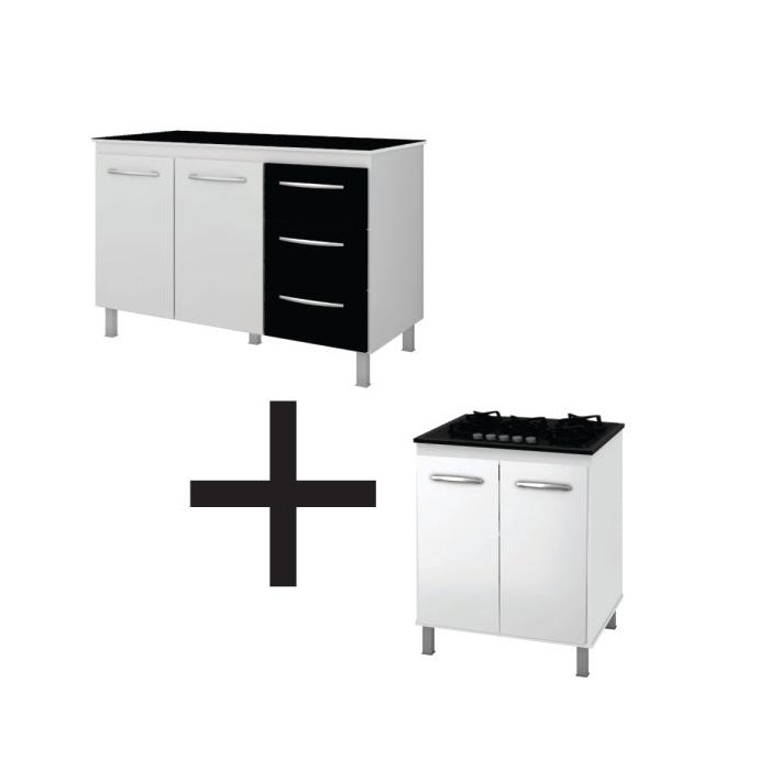 Kit Balcão Gabinete Pia Armário Cozinha 120cm Camile Brc/Pto com Tampo Pto + Balcão para Cooktop