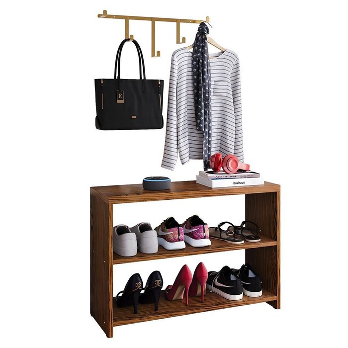 Kit Banco Sapateira Organizadora Porta Sapato Freijó Cabideiro Fixo Parede Quarto Hall Dourado -