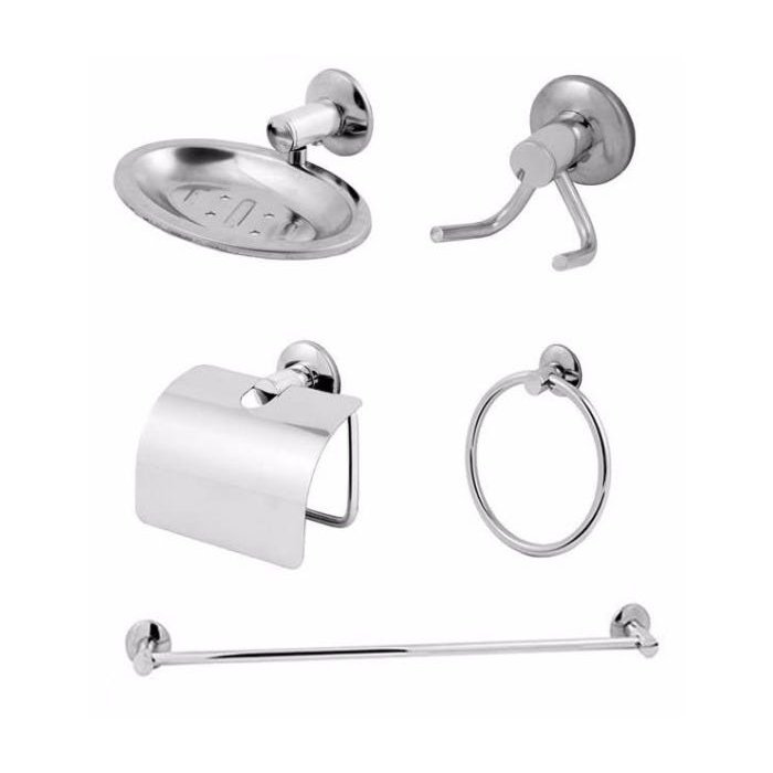 Contém: 1 porta toalha de rosto, 1 porta toalha de banho, 1 cabide duplo, 1 papeleira, 1 saboneteira, 6 canoplas, 12 buchas e 12 parafusos.