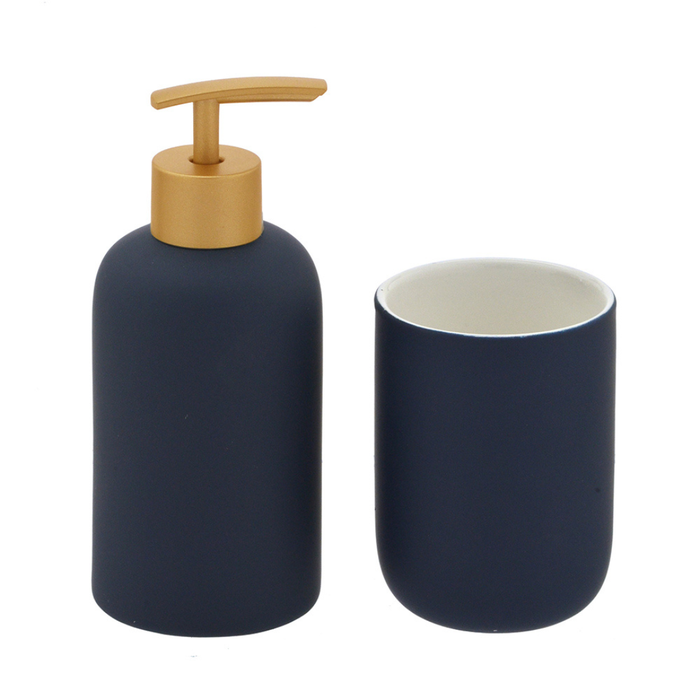 DIMENSÕES:Porta Sabonete Líquido: Alt 16,5 cm; Diâmetro: 7 cm;CORES:Azul Marinho e Dourado.MATERIAL:Cerâmica.