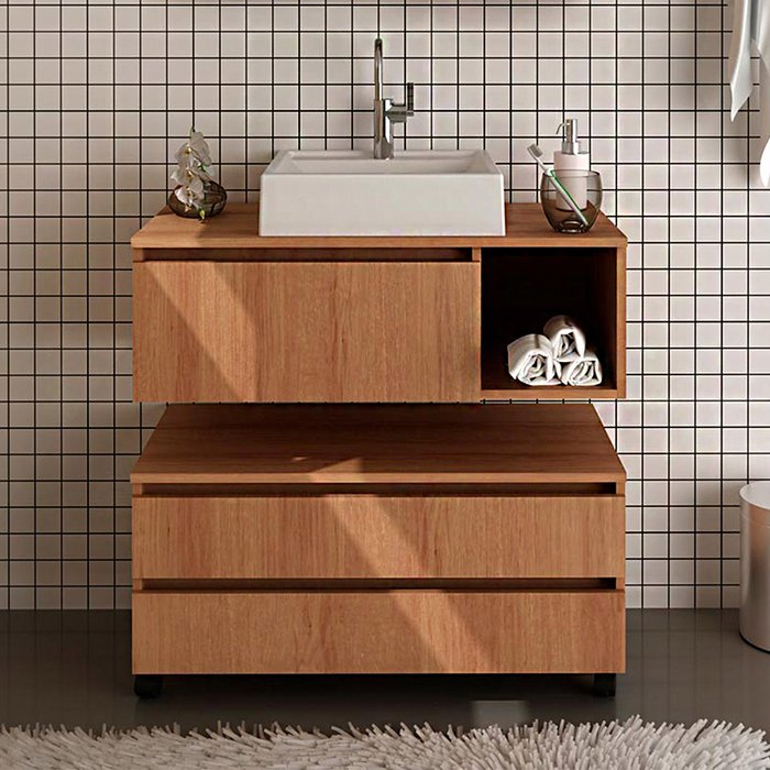 Kit Banheiro Com Cuba Inclusa Gabinete e Balcão Móvel Cor: Amêndoa Amêndoa