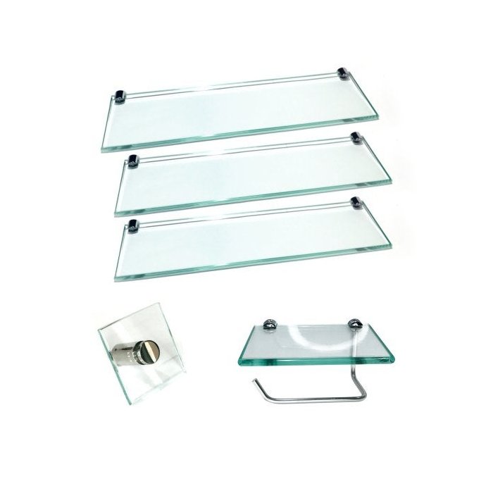 Kit Banheiro em Vidro Para Lavabo Modelo 5, acompanha 5 peças, todas completa com fixação, bucha e parafuso, ideal para banheiro pequeno ou Lavabo.