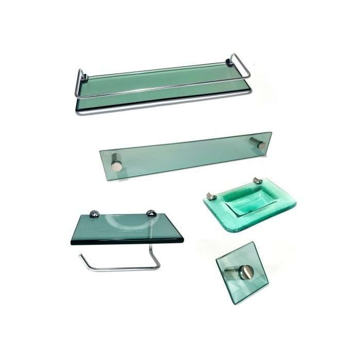 Kit Banheiro em Vidro Solteiro Modelo 2, acompanha 5 peças, todas completa com fixação, bucha e parafuso, ideal para Banheiro de pequeno solteiro.