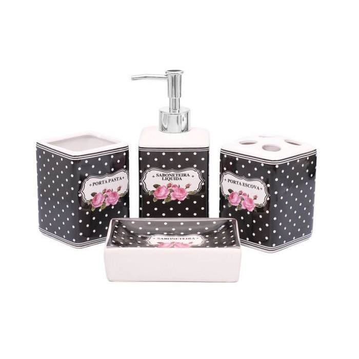 Kit Banheiro Lavabo Conjunto Porta Sabonete Líquido Escova - Preto Preto