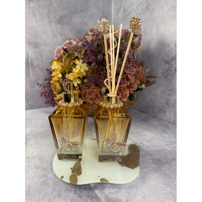 Cada frasco possui um design moderno, com linhas retas e acabamento Brilhante. Como toque final, ambos são adornados com um pingente de borboleta com strass pendurado por uma delicada corrente metálica, trazendo um visual de joia decorativa.