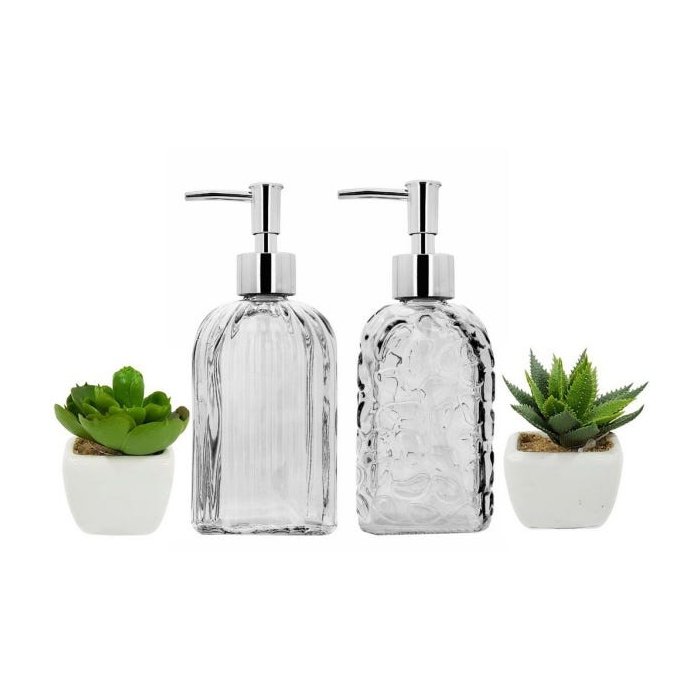 Kit Banheiro Porta Sabonete Líquido Vidro Clear e Mini Vaso Suculenta 4 Peças