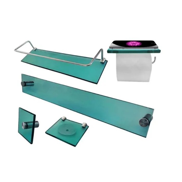 Kit Banheiro Vidro Luxo Reto 5 peças Verde Mar Verde Mar