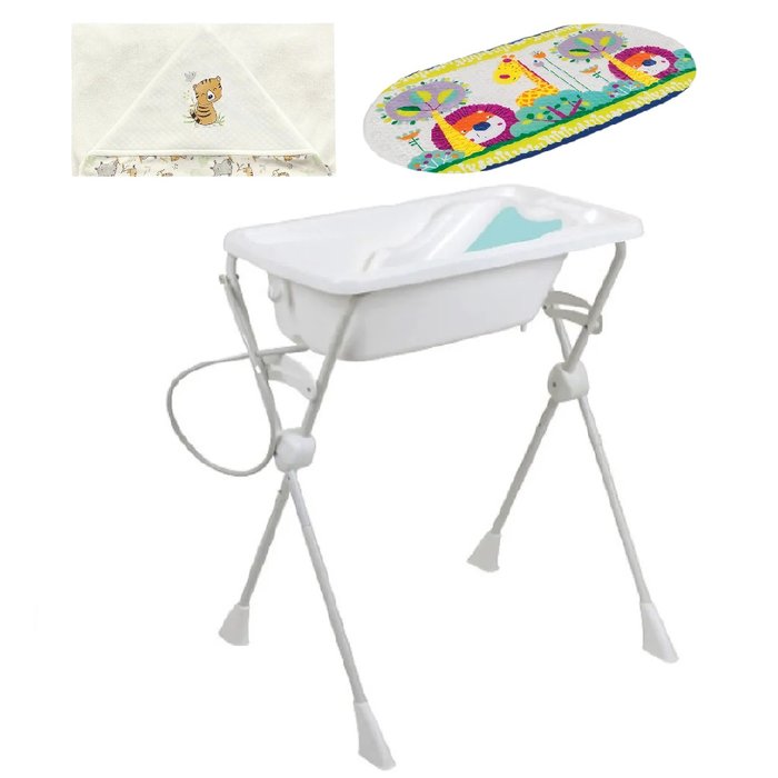 Kit Banho Banheira Redutor E Suporte Branco - Burigotto O Kit Banho da Burigotto foi desenvolvido especialmente pensando na praticidade para os pais e no conforto dos seus pequenos. Sem dores na coluna com o suporte para elevação da banheira, sem preocupação com o escoamento de água pois possui mangueira. E o principal que é o assento redutor, para que os pais não precisem usar a força segurando o bebê. Capacidade Máxima do Suporte: 20kg Sendo: criança até 10kg + 10 litros de água Medidas do Produto Aberto: Peso: 4,90 kg Altura: 90 cm Largura: 69 cm Comprimento: 77 cm Tapete Para Banho Safari - Buba Baby O Tapetinho Safari da Buba vai deixar o banho dos pequenos mais seguro! Com superfície texturizada e ventosas que aderem ao piso, evita que as crianças escorreguem durante o banho. Estampado com animais da selva, vai encantar as crianças e deixar o banheiro mais alegre! A linha de banho da Buba traz itens pensados com muito carinho para os bebês, através de cores, formas e atividades que estimulam os sentidos. Além de tornar a hora do banho muito mais divertida. Toalha de Banho Safari - Hug A Toalha de Banho Hug é perfeita para ser levada para a maternidade. Pois quando o bebê nasce, sua pele ainda é muito sensível e frágil, e a toalha de banho Hug possui toalha fralda em algodão, que é ótima para não agredir a pele do recém-nascido. Além disso, possui capuz, perfeito para cobrir a cabeça do bebê e levá-lo para a troca de roupa. DIFERENCIAIS: -Toalha fralda em algodão, perfeita para a pele sensível do recém-nascido. -Capuz. -Matelassê com nanotecnologia que agrega maciez e tratamento anti pilling, que torna o produto mais resistente às lavagens, proporcionando maior durabilidade, e retardando o aparecimento das bolinhas na malha. -Suedine com nanotecnologia que agrega maciez e tratamento antibacteriano e antifúngico. -Bordado protegido com aplique e estampa rotativa exclusiva Hug. Medidas da Embalagem: Peso: 6 kg Altura: 61 cm Largura: 79 cm Comprimento: 21 cm Kit contém: 1 Banheira Burigotto Suporte para a banheira com pernas desmontáveis. 1 Assento redutor de profundidade para recém-nascidos 1 Mangueira para escoamento da água 2 plugs, sendo um para a banheira e outro para a mangueira Gancho para guardar e ocupar menos espaço 1 Tapete para banho safari Buba Baby 1 Toalha de banho safari Hug