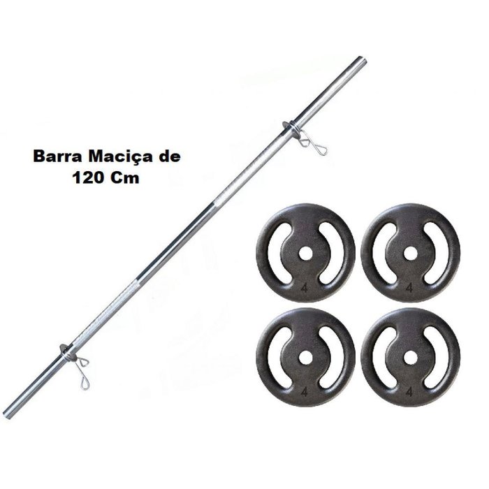 Kit Barra Maciça Recartilhada 120 Cm com 16 Kg de Anilhas