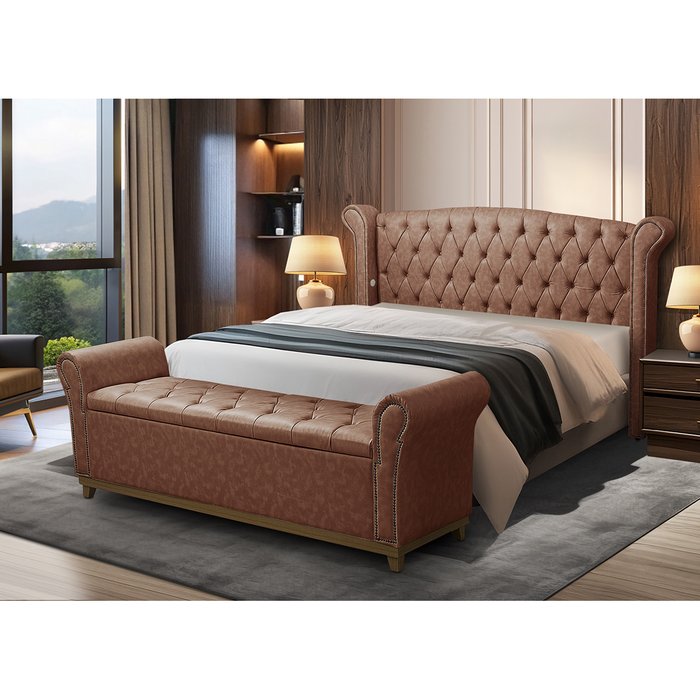 Kit Baú e Cabeceira de Madeira Couro Sintético Grécia Queen:1827