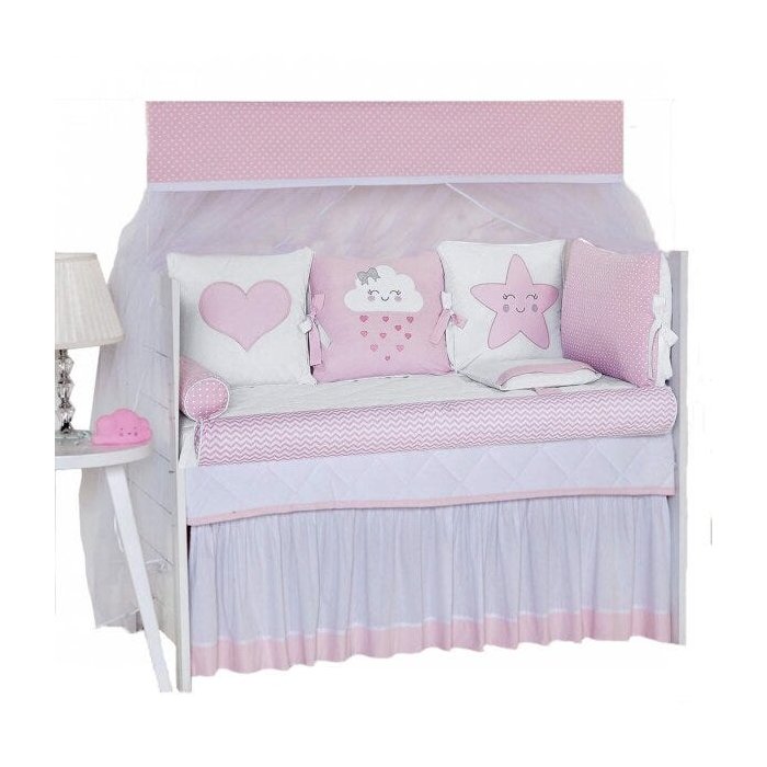 | Itens Inclusos | 1 Cabeçeira com zíper, 1 Edredom de berço, 1 Lençol de cima, 1 Lençol de baixo com elástico, 1 Fronha, 1 Mosquiteiro varal tule, 1 Bando decorativo, 3 Laterais, 1 Rolo lateral. |