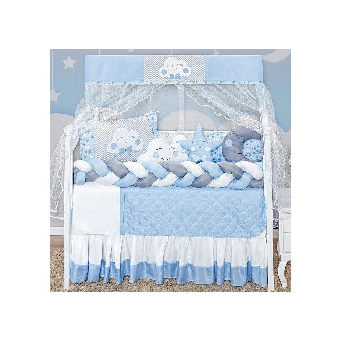 Kit Berço Completo Nuvem Trança Com 12 Peças Bebê Menina Menino - Azul Bebê