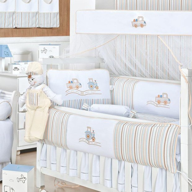 Os Kits de Berço foram desenvolvidos para mamães de bom gosto que não abrem mão de qualidade. Ele é confeccionado em Piquet 100% Algodão, todos são para Berço Padrão Americano, possuem um design bonito e elegante. Sua Cabeceira e Laterais possuem zíper em toda sua extensão, o que facilita o manuseio do enchimento na hora da retirada para lavagem. Sua Manta é Bicomponente, o que significa que não possui nenhum tipo de resina, sendo um material Atóxico e Antialérgico.Seu Edredom é Matelado para manter seu bebê sempre aquecido e seu berço com uma cobertura elegante, devido ao designe de seu desenho.O Lençol de Cima possui barra em toda sua extensão para um melhor acabamento e finalizando com Lasie na ponta. O Lençol de Baixo com elástico, possui elástico e barra em toda a sua extensão, o que proporciona maior firmeza depois de colocado, além do acabamento ficar perfeito.O Mosqueteiro possui um Bandô que dá um caimento maravilhoso no berço, além se ser separado do Tule, pra um melhor aproveitamento na hora de arrumar no berço. O Tule é super resistente para proteger o bebê de qualquer tipo de sujeita ou insetosTem ainda os Enfeites ou Almofadas que deixam o Kit muito mais bonito e moderno.Obs – Todos os nossos Kits de Berço, são para Berço Padrão Americano.CONTEÚDO:01 - Cabeçeira - 65 cm x 43 cm (Comp x Larg )02 - Laterais - 1,30 mts x 35 cm (Comp x Larg )01 - Edredom - 1,40 x 1,03 mts (Comp x Larg )01 - Lençol de Cima - 1,59 mts x 95 cm (Comp x Larg )01 - Lençol de Baixo - 1,57 mts x 1,06 cm (Comp x Larg )01 - Fronha - 38 cm x 27 cm (Comp x Larg)01 - Mosquiteiro – 1,90 mts x 1,30 mts (Comp x Larg )01 - Bandô: 1,90 x 20 x 1,30 mts (Alt x Larg x Comp)COMPOSIÇÃO:Tecido Piquet - 100% AlgodãoTecido Estampado: 100% AlgodãoTecido Liso: 100% AlgodãoTule - 100% PoliamidaEnchimento: Manta AcrílicaGARANTIA:Contra defeitos de fabricação;Produto 100% Nacional* As fotos são meramente ilustrativas, as cores podem variar de acordo com o monitor;* O ambiente da foto é apenas uma representação, leia atentamente a descrição para saber a qual produto se refere;* Caso tenha alguma dúvida utilize nossos canais de contatos para esclarecimentos, teremos o maior prazer em atendê-los da melhor forma possível.