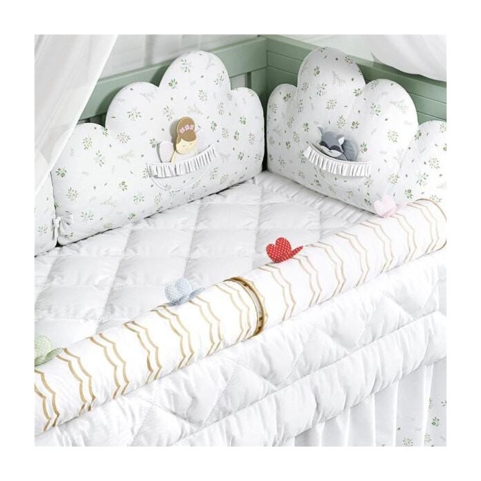 Todos os protetores já vêm amarris para fixação no berço, enchimento fofinho e zíper, para facilitar a lavagem. Os bichinhos de tecido são bordados e ficam costurados aos bolsinhos.