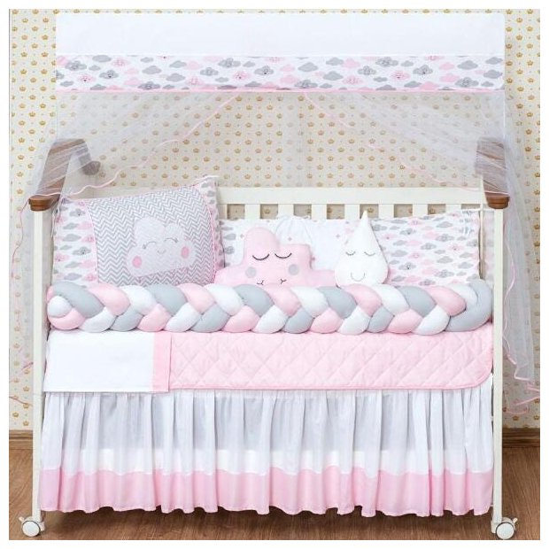 Kit Berço Menina Nuvem Trança 12 Peças Com Mosquiteiro