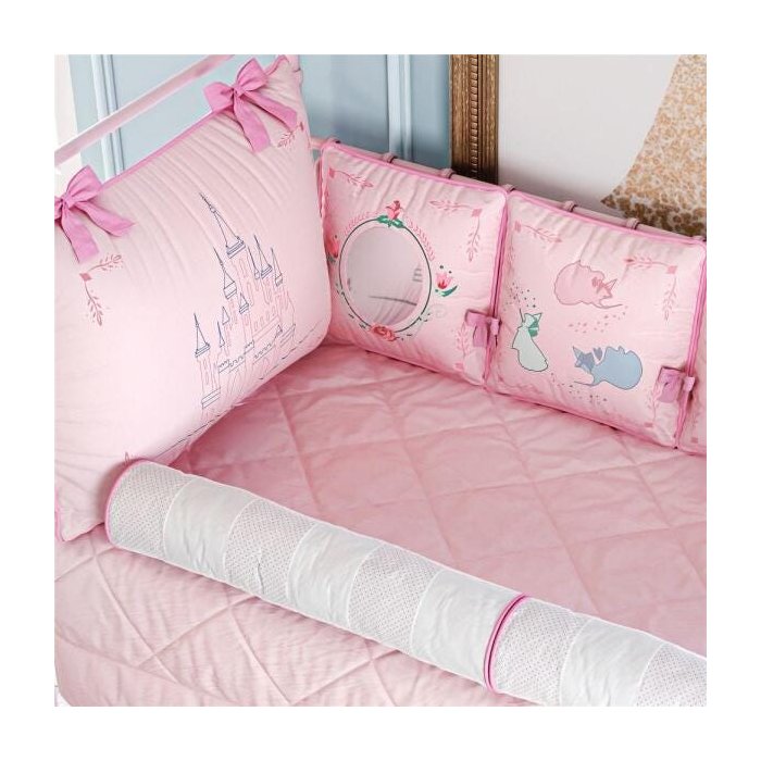 Na cabeceira, um dos castelos mais famosos do mundo! E esse conjunto completo ainda conta com dois rolinhos protetores, jogo de lençol, um edredom leve ideal para todas as estações e um mosquiteiro varal com bandô bordado. Tudo para você receber o sonho mais bonito com muito conforto e originalidade!
