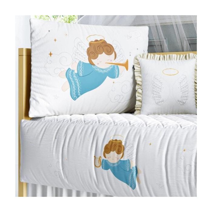 O Kit Berço Anjinho Azul traz estampas exclusivas em alta definição para compor a decoração do quarto de bebê com aconchego e originalidade. Um enxoval com cores suaves para receber o novo menino da família com muito amor. Entre nuvens e estrelinhas, anjos com harpas representam a harmonia e a pureza. Confira os detalhes e encante-se com esse produto original: