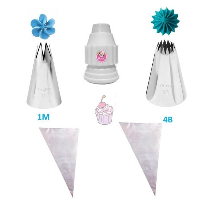 | Nome | Kit bicos de confeitar wilton 1m e 4b + adaptador e sacos |