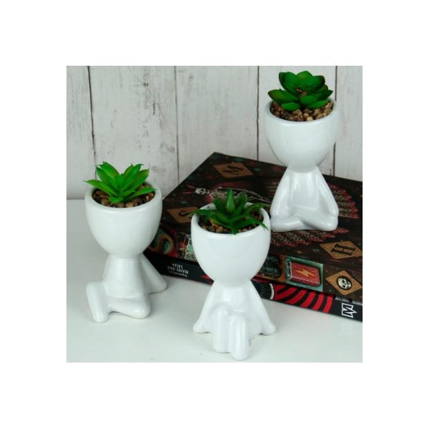 Kit com 3 Vasos de Porcelana Bob Robert Plant Decorativo.Acompanham Planta Suculenta Artificial3 Posições, cada um em posição diferente : Ioga, Sentado com perna deitada e Sentado com perna para Frente.
