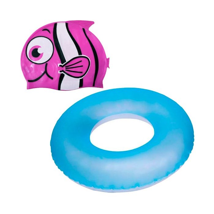 Kit Bóia Redonda Neon Azul + Touca Natação Peixinho Rosa