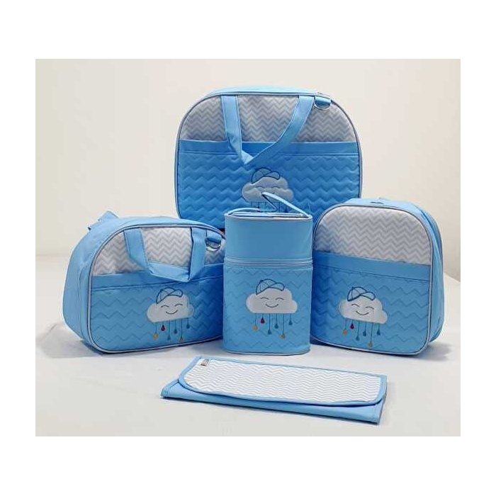 Kit Bolsa Maternidade - Bordada - 05 Peças - Tecido Impermeável - Mappyng Baby - Nuvem Azul Claro