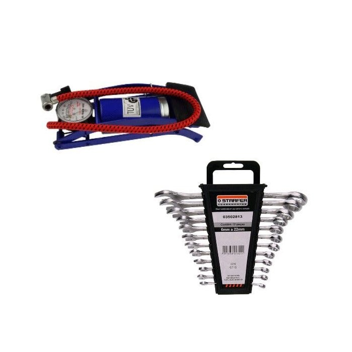 Kit incluindo Bomba de Ar Pedal para Pneu, Bike, Colchão Inflável Starfer + Jogo de Chave Combinada Starfer de 6 á 22mm E Estrela 12Peças