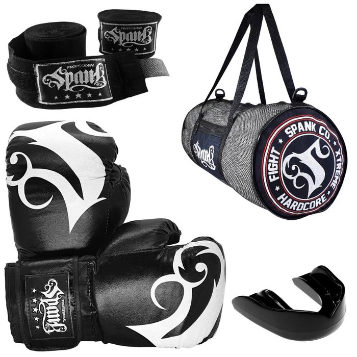 Kit Boxe Kickboxing Spank Luva+Bandagem+Bucal+Bolsa Um Par de Luva de Boxe Spank Disponível nos Tamanhos.Um Par de Bandagem Spank de 3 metros.Um Protetor Bucal Básico Spank Um Bolsa para transportar os produtos. Ficha Técnica dos Itens. FICHA TECNICA: BOLSA: Confeccionado em Tela Dupla de nylon que permite 100% de respiração para osequipamentos carregados em seu interior.Fechamento em zíperBolsos nas lateraisAlça removível para os ombros e alças menores para as mãos.Medidas: A22 x L22 x C52cmTAMANHO ÚNICO. LUVA: Revestimento em couro sintético de alta qualidade e resistência.Enchimento com camada de espuma extra para alta absorção de impactos.Cano da luva com tamanho regular.Costuras de alta precisão e linha forte para couros.Revestimento interno: Tecido Bactericida.Fechamento em rápido de alta resistência. BANDAGEM: Um Par de Bandagens (1 Faixa para mão direita e 1 Faixa para mão esquerda)Possui 3 metros de comprimento, possibilitando a bandagem completa da mãoFeita de Poliamida que possui elasticidade de alta qualidadePossui fechamento rápidoLargura: 5cmEmbalagem com 1 parMarca: Spank BUCAL: Compacto e resistente.Feito em E.V.AMaterial não ToxicoFácil de MoldarMarca Spank. O kit reúne os itens básicos para treinamento de Boxe, todos os produtos são da marca nacional Spank Co.