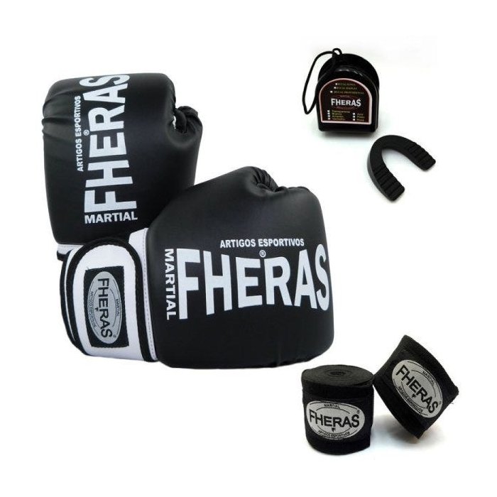 Kit Boxe Muay Thai Fheras Luva Bandagem Bucal - 14 oz Preto/Branco