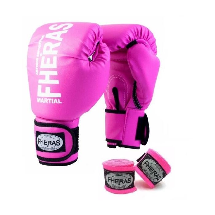 Kit Boxe Muay Thai Fheras Luva Bandagem Rosa 10OZ